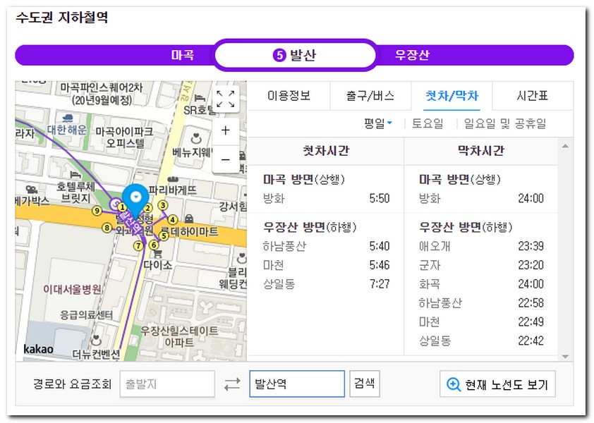 발산역에서의 첫차 시간과 막차시간도 확인할 수 있다. 평일, 토요일, 일요일 및 공휴일 시간대별로도 물론 확인 가능하다. 서울 지하철 5호선 노선도를 보게되면 편의시설별로 조회가 가능하다. 개찰구 내부 화장실이 있는곳의 역을 확인할 수 있다.