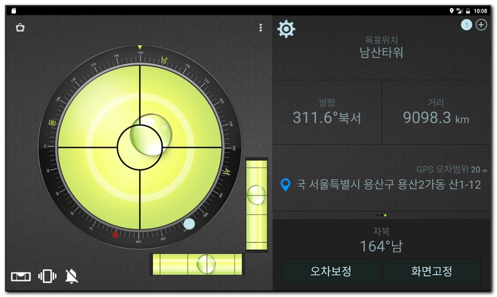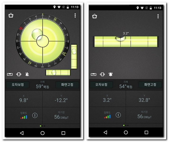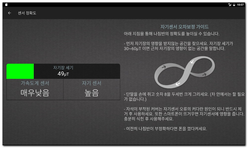 일반적으로 나침반 정확도를 올리기 위해서는 화면 하단 패널의 아래 두 값을 보게 되면 정확도는 자기센서의 정확도를 게이지 형식으로 최소 0단계에서 5단계로 표현하고 있으며, 자기장은 기기 주변의 자기장을 숫자로 표시해야 된다.