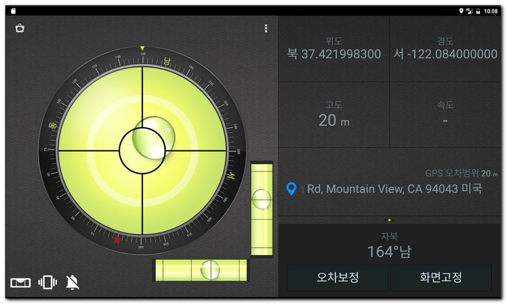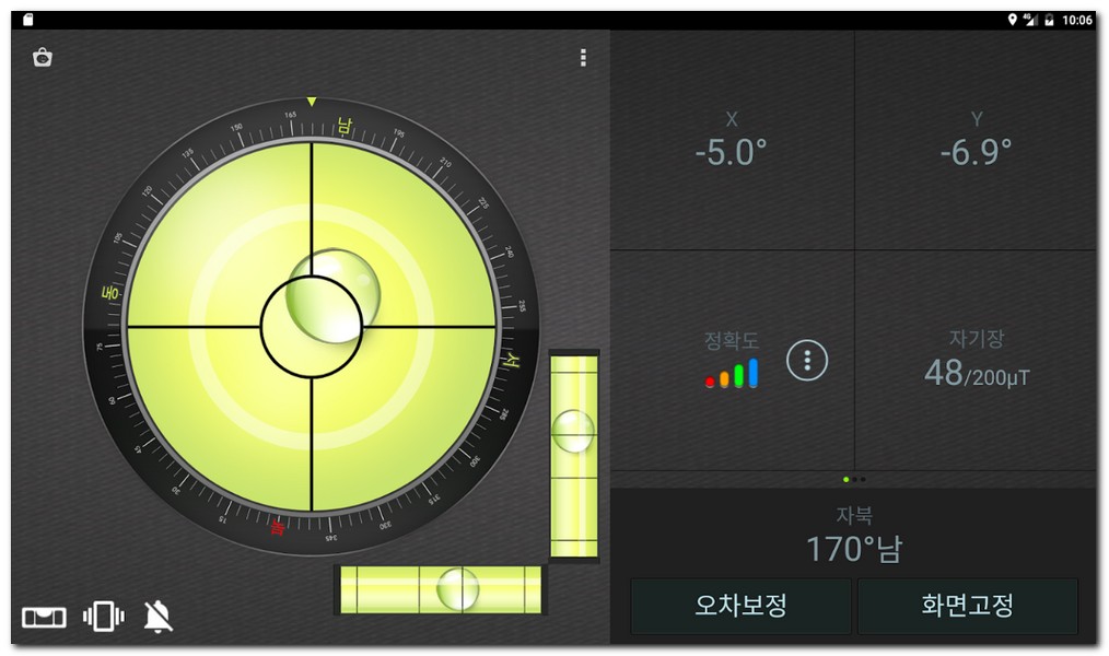 수평계 사용을 위해서는 화면 중앙 원이 과녁처럼 되어 있는데, 가운데 있는 검은색 원에 구슬이 가까이 갈수록 수평에 가깝다는 것을 알려주게 된다.