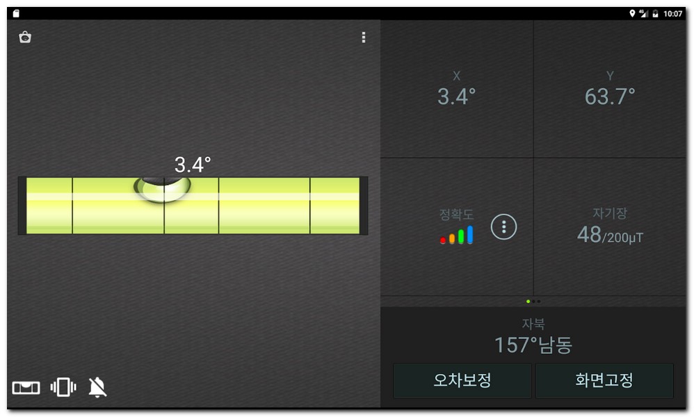 수직으로 세웠을때에는 원형 수평계가 나올려면 수평계 원 좌측 하단에 위치한 수직 모드 버튼을 터치하여 비활성 상태로 만드면 된다.