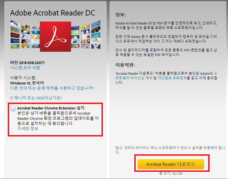 우선 링크 연결된 페이지에 접속을 시도한다. Acrobat Reader Chrome Extension 설치가 기본적으로 체크 표시되어 있다. 하지만 Acrobat Reader Chrome Extension 설치할 필요성이 전혀 없기 때문에 체크 해제를 꼭 해주는게 좋다.