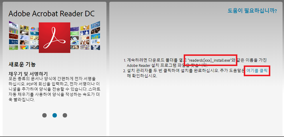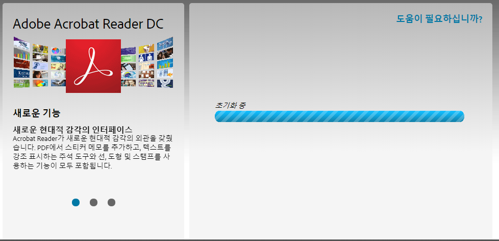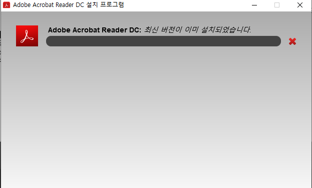 다운로드 받은 파일을 더블클릭하거나 한 번만 클릭하게 되면 자동으로 설치 진행된다. 이미 자신의 PC에 어도비 아크로뱃 리더 설치가 된 상태라면 최신 버전이 이미 설치되었습니다. 라는 메시지와 함께 설치 진행이 안된다.