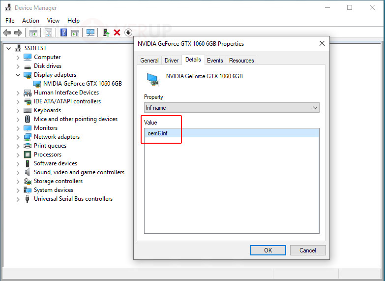 1. 장치 관리자로 가서 NVIDIA 그래픽 어댑터를 열고 "세부 정보"로 이동하여 "Inf Name"을 선택한다. 이 경우 "oem6.inf"인 값을 메모해 둔다. 그러나 이것은 시스템마다 다를 수 있으므로이 단계를 건너 뛰면 안된다.
