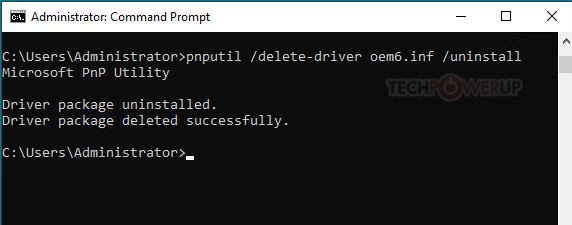3. 그런 다음 "pnputil / delete-driver oemX.inf / uninstall"명령 프롬프트에 다음 명령을 입력하고 "X"를 첫 번째 단계에서 얻은 번호로 바꾸도록 한다. (oem6.inf를 사용하였음).