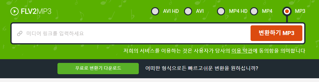 5위. FLV2MP3. https://www.flv2mp3.by/kr/ FLV2MP3 웹사이트는 유튜브 mp3 음원추출 사이트중 5위에 랭킹하게 되었다. AVI HD급, MP4 HD 급등으로 영상 변환이 가능하며, 추가적으로 유튜브 영상을 mp3로 변환해줄 수 있다.