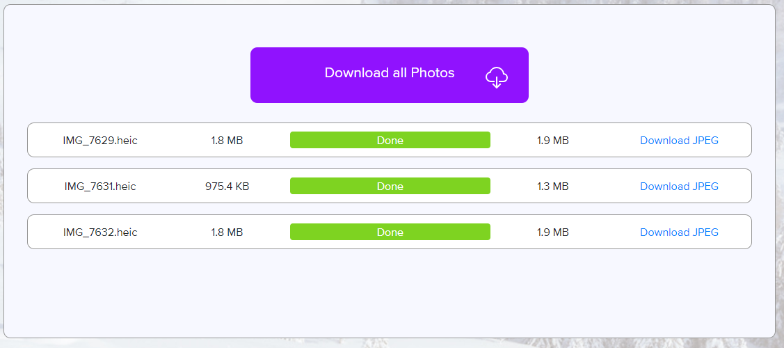 기본적으로 heic 이미지 파일의 용량이 더 적다. 변환된 파일을 [Download all Photos]를 선택해서 다운로드 한다.