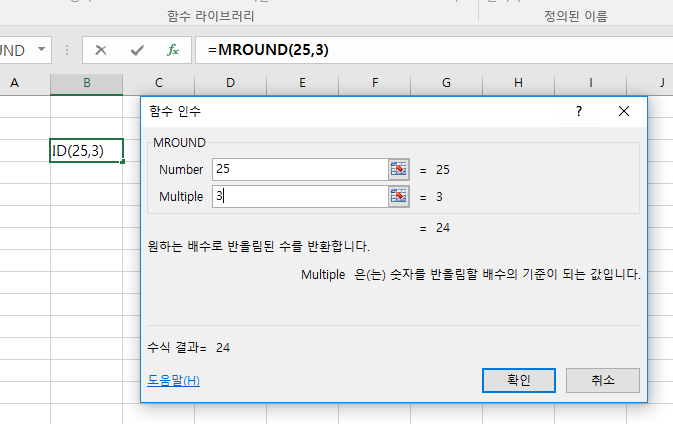 함수 인수 부분에서 MROUND Number 값을 25, Multiple 3을 입력해준다. 그럼 원하는 배수로 반올림된 수를 반환한 값이 24가 출력되게 된다.