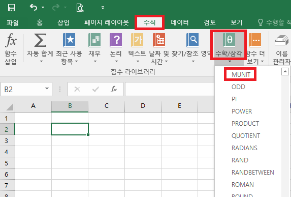엑셀 MUNIT 함수 수식을 정상적으로 사용하기 위해서는 수식 -> 수학/삼각 -> MUNIT 선택한다.