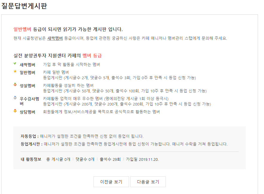 사진과 같이 질문답변게시판 이라는 곳에 들어가보려고 했는데, 멤버 등급이 낮아서 들어갈 수 없었다. 회원가입 없이 들어가보려고 했는데, 안되어서 회원가입 까지 했는데, 등급에서 걸리게 되었다.