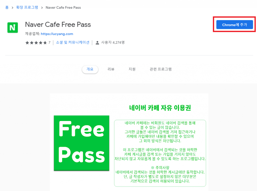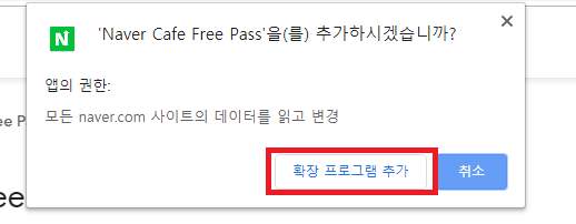 Naver Cafe Free Pass 확장 프로그램 추가를 하겠냐고 물어보는데, 추가하도록 하자.
