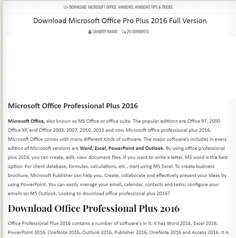 링크 연결된 페이지로 이동한다. Microsoft Office Professional Plus 2016 Full Version 페이지이다. 워드(Word), 엑셀(Excel), 파워포인트(PowerPoint), 아웃룩(Outlook)에 대한 설명을 해놓았다.