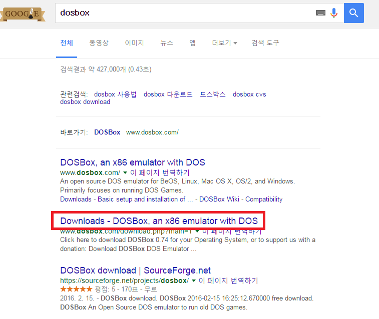 일단 처음에는 도스박스를 다운로드 하려면 웹사이트에 접속해야된다. 이렇게 구글에서 'dosbox' 라는 검색어를 입력하게 되면 상단 쯤에 Downloards - DOSBox 라는 문서가 보인다. 클릭해서 들어가자.