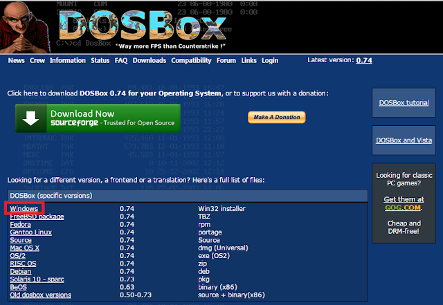 도스게임을 실행하는 프로그램은 대표적인게 도스박스(dosbox) 라는 프로그램이다. 당연히 오픈소스 이며, 무료로 다운로드 해서 사용할수 있다.