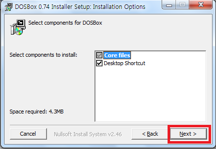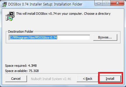 마지막으로 'Install' 버튼을 선택해서 최종설치를 완료한다. 그럼 도스박스(dosbox) 설치가 완료가 된 것이다. 굉장히 빨리 설치되었다. 바탕화면에 보면 'dosbox' 실행파일이 보인다. 더블클릭해서 실행 한다.