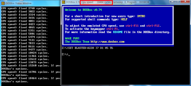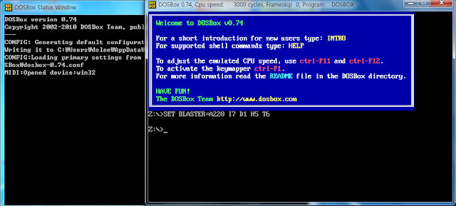사진과 같이 도스창이 2개 나타나는데, 오른쪽 그림처럼 키보드를 입력할수 있는 창이 보인다. 이상한 문제가 보이는데, set blaster=A220 I7 D1 H5 T6 이부분은 오래전에 도스게임으로 게임을 해봤다면 알 수 있는 명령어다. 사운드카드 설정 부분인데, 자동으로 설정이 된다.