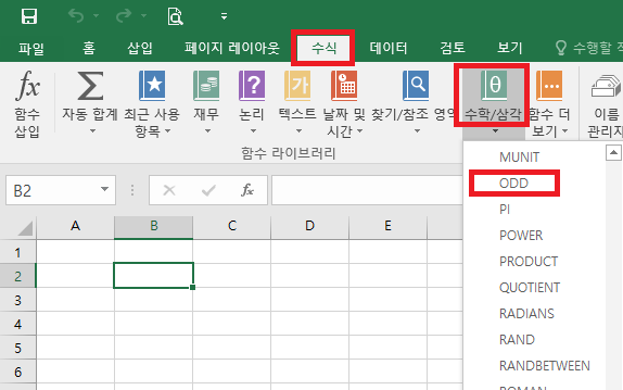 엑셀 ODD함수를 사용하려면 엑셀2016 프로그램을 실행시켜서 수식 -> 수학/삼각 -> ODD 함수를 선택하면 된다.