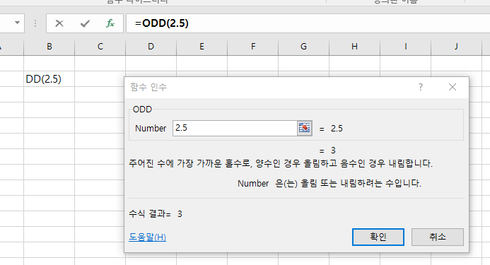 함수 사용방법은 Number 부분에 값을 입력하게 되는데, 주어진 수에 가장 가까운 홀수로, 양수인 경우 올림하게 되고, 음수인 경우 내림하여 결과값이 출력된다.