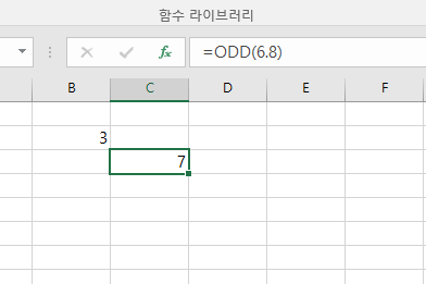 함수 수식 입력란이나 빈 공간 셀에 =ODD(6.8) 와 같이 입력해도 결과값이 출력된다. 6.8의 결과값은 7이 된다. 양수인 경우 올림하기 때문이다.