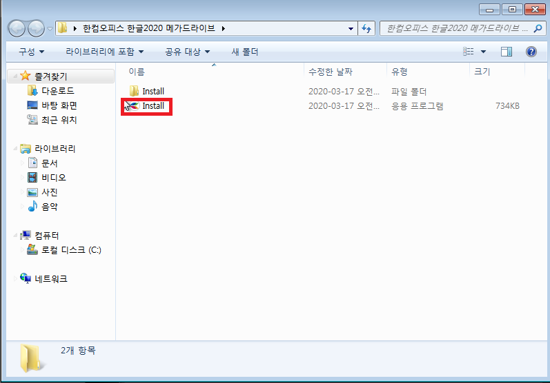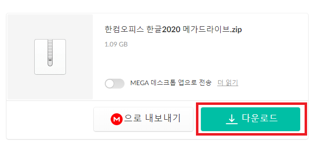 한컴오피스 한글2020 메가드라이브.zip 파일을 다운 받고 설치 진행한다.