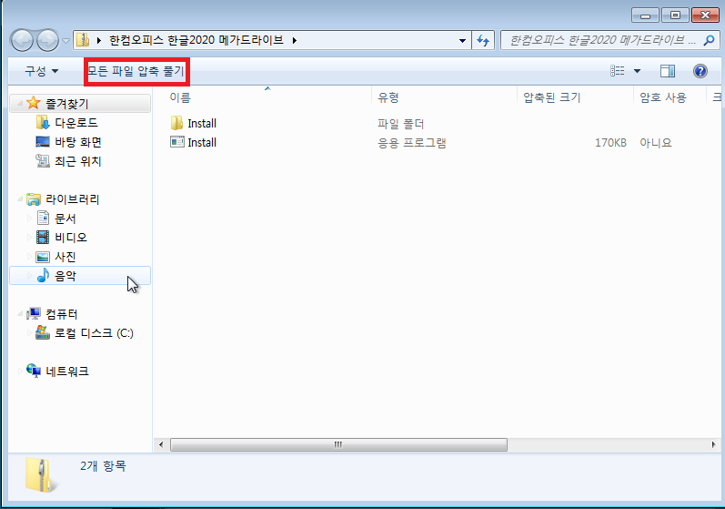 다운로드 받은 한글2020 메가드라이브.zip 압축파일을 해제 해야 된다. 알집, 반디집, 7zip 같은 프로그램을 이용해서 압축해제 해도 되고, 윈도우7, 10 기본 압축해제 프로그램을 이용해서 해제 해도 된다.