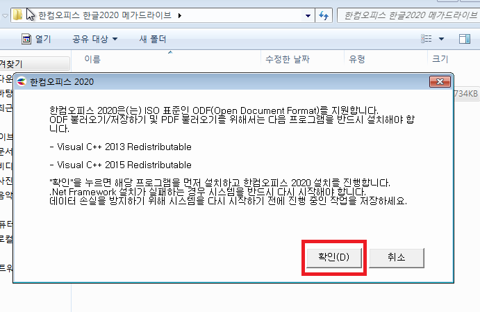 한컴오피스2020 설치에 앞서 한컴오피스2020은 ISO 표준인 ODF(Open Document Format)을 지원합니다. ODF 불러오기, 저장하기 및 PDF 불러오기를 위해서 반드시 Visual C++ 2013 Redistributable, Visual C++ 2015 Redistributable 설치해야된다.