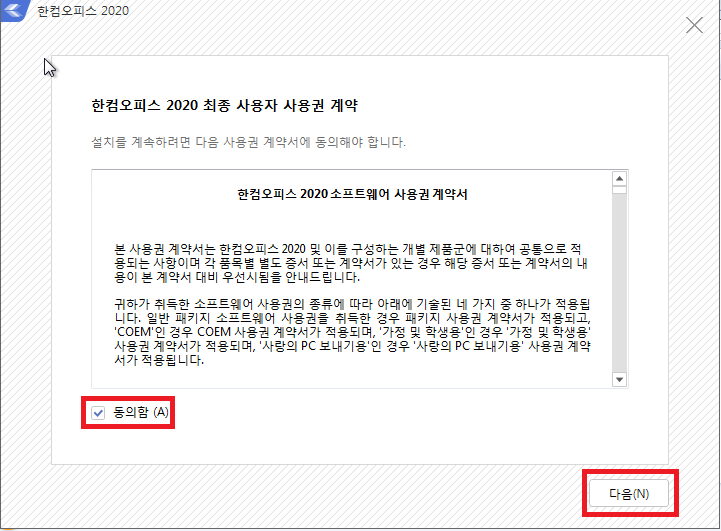 설치에 앞서 최종 사용자 사용권 계약에 대해서 동의함을 클릭하고, 다음을 눌러준다.