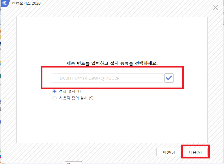 한컴오피스 한글2020 제품 번호 입력은 자동으로 된다. 다음을 눌러준다.